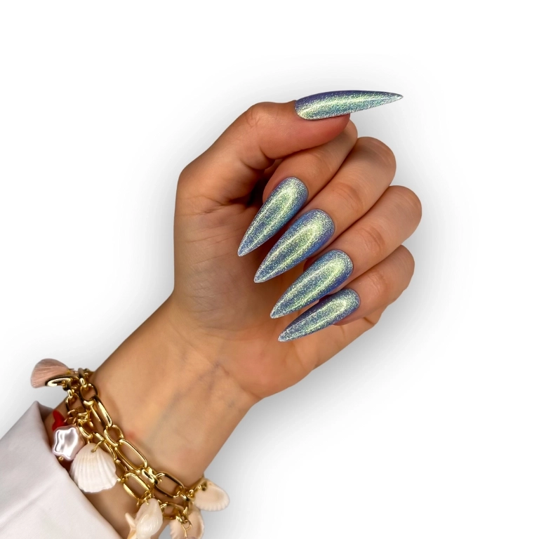 Un set d'ongles aux reflets métallisés multiples. En fonction de la luminosité, votre set d'ongles est plus ou moins foncé et coloré. Il est absolument sublime. ✨🫐
